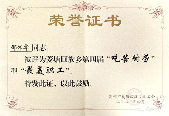 公司设备部副部长、电气工程师邵怀华被表彰为菱塘回族乡第四届“最美职工”,扬州市总工会党组成员、副主席韩士军为邵怀华等三名获奖者颁奖,并由公司获得乡“最美职工”邵怀华代表乡第四届“最美职工”全体获奖者向全乡所有劳动者发出了“听党话、跟党走,担当历史责任;学技术、练技能,争当能工巧匠;精雕琢、细打磨,制造优质产品;干一行、爱一行,创造美好生活”的倡议。
