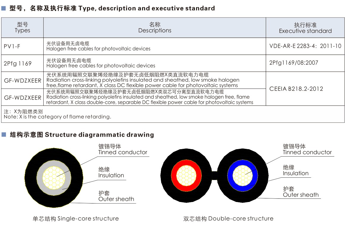 太阳能光伏发电设备用无卤电缆,是根据光伏发电设备所处的特殊环境条件设计的,主要适用于直流电压端,发电设备引出连接和组件间汇流连接,最高直流1.8kV的光伏发电设备系统。